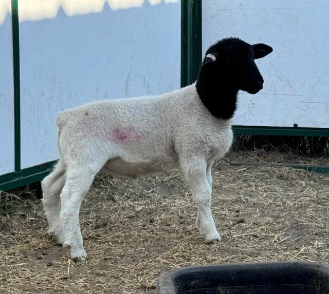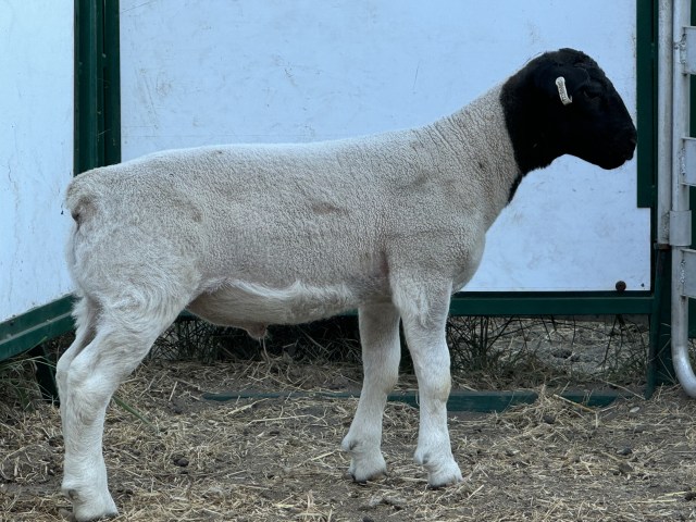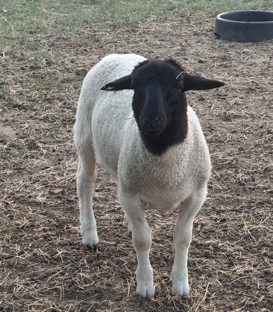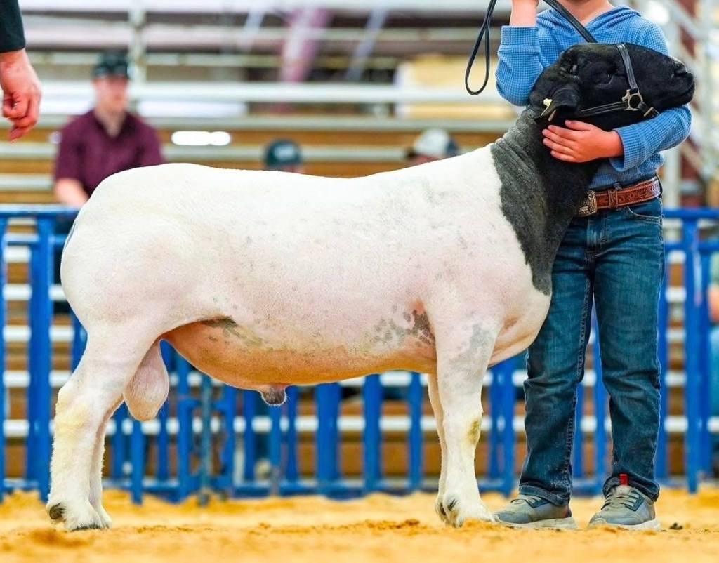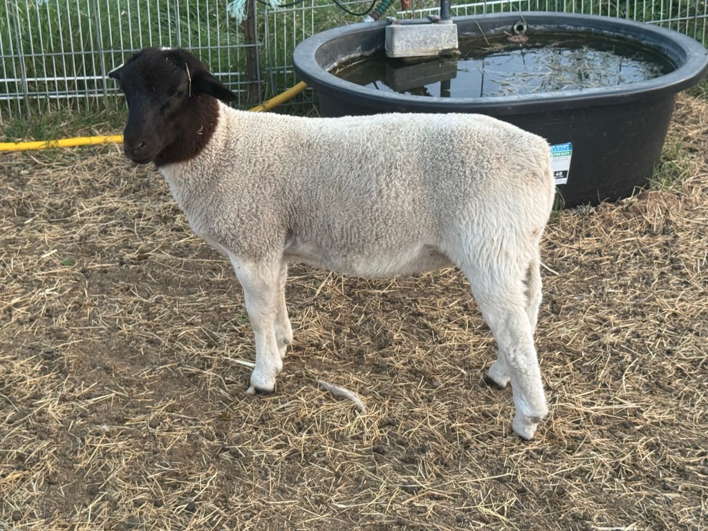 We recently purchased a new ram to take over breeding duties, starting in the fall of 2025. This hunky guy is also a Fullblood and was bred by Charles Seidensticker in Comfort, TX. His pedigree is primarily from Roeder Ranch (ICON) from Fredericksburg. He was the Reserve Champion Open Sheep Dorper Ram at the San Antonio Stock Show in 2025, and was born in March of 2023.