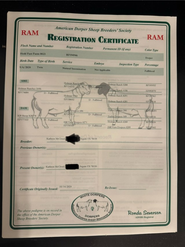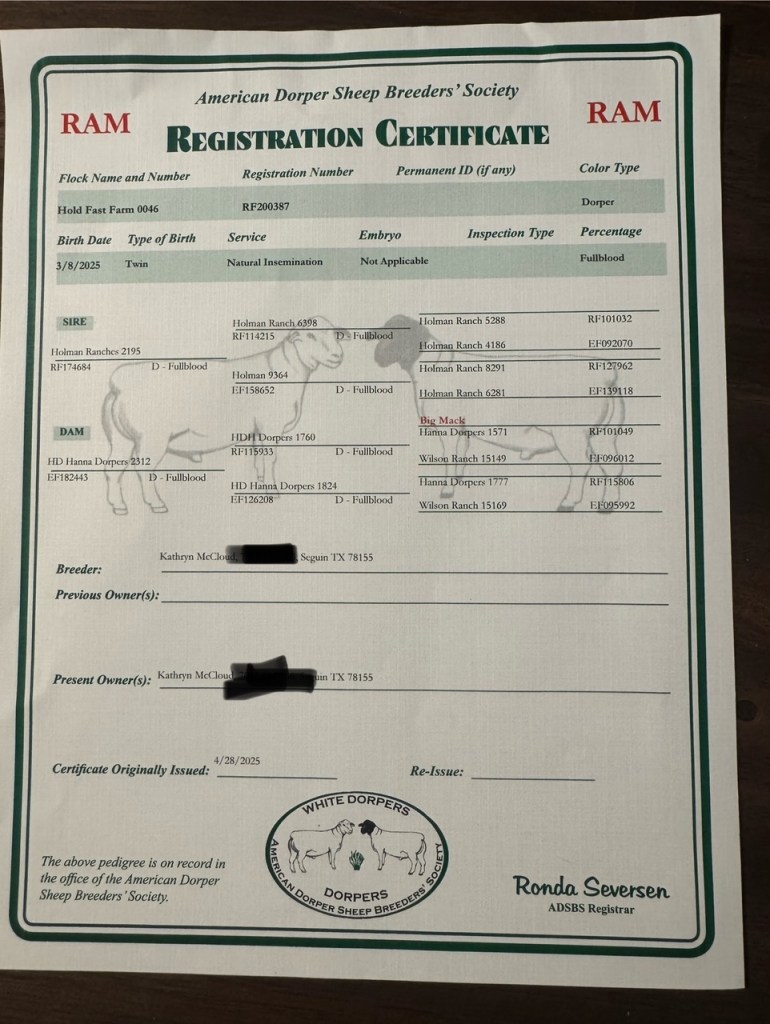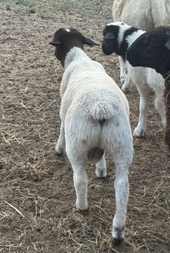 Our first registered fullblood Dorper ram was purchased in December of 2023. He is a son of Holman Ranch 6398 and was bred by Holman Ranches of Sonora, TX.